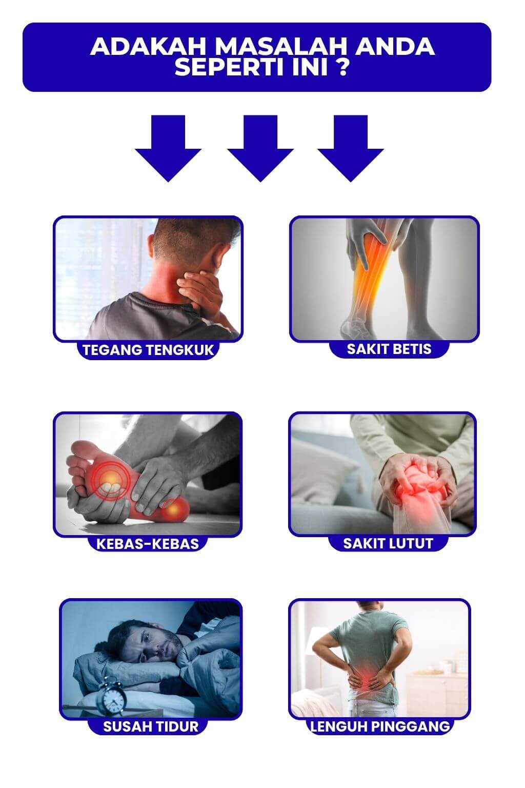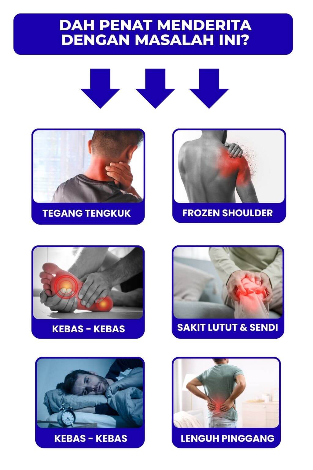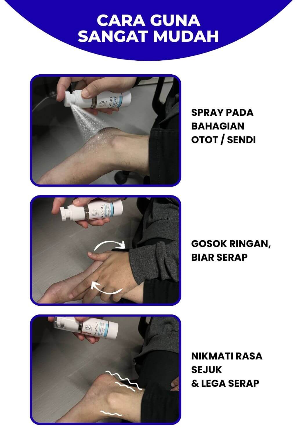 Spray terus pada bahagian bermasalah (lutut, kaki, pinggang atau bahu) → gosok ringan supaya cepat serap → biar kering.